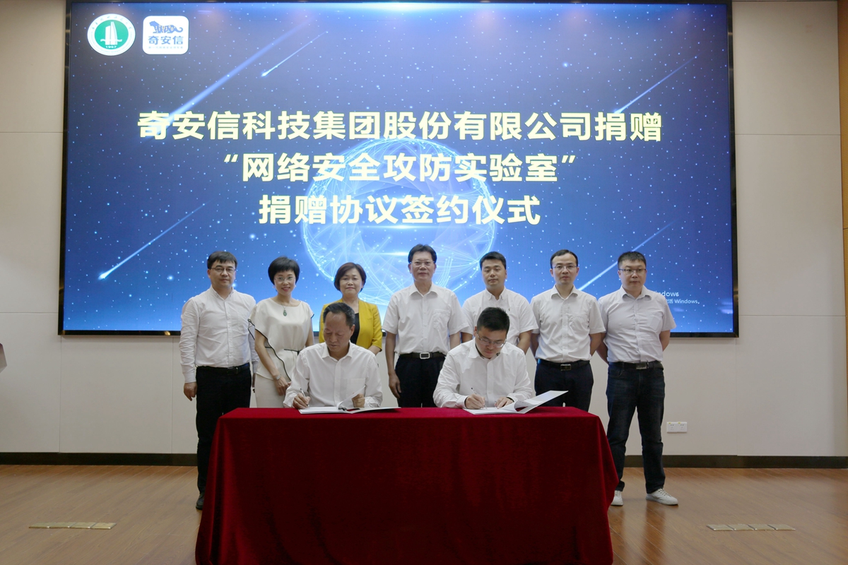 6月22日,我校信创与网络安全产业学院成立暨奇安信科技集团股份有限公司捐赠网络安全攻防实验室仪式在西校区实验楼一楼报告厅顺利举行。奇安信集团副总裁刘进等企业相关负责人,学校党委书记凌靖波、校长戴青云、副校长黄秋文以及学校相关单位负责人,网络空间安全学院师生代表参加了活动。活动由戴青云主持,凌靖波、刘进分别代表校企双方作了致辞。