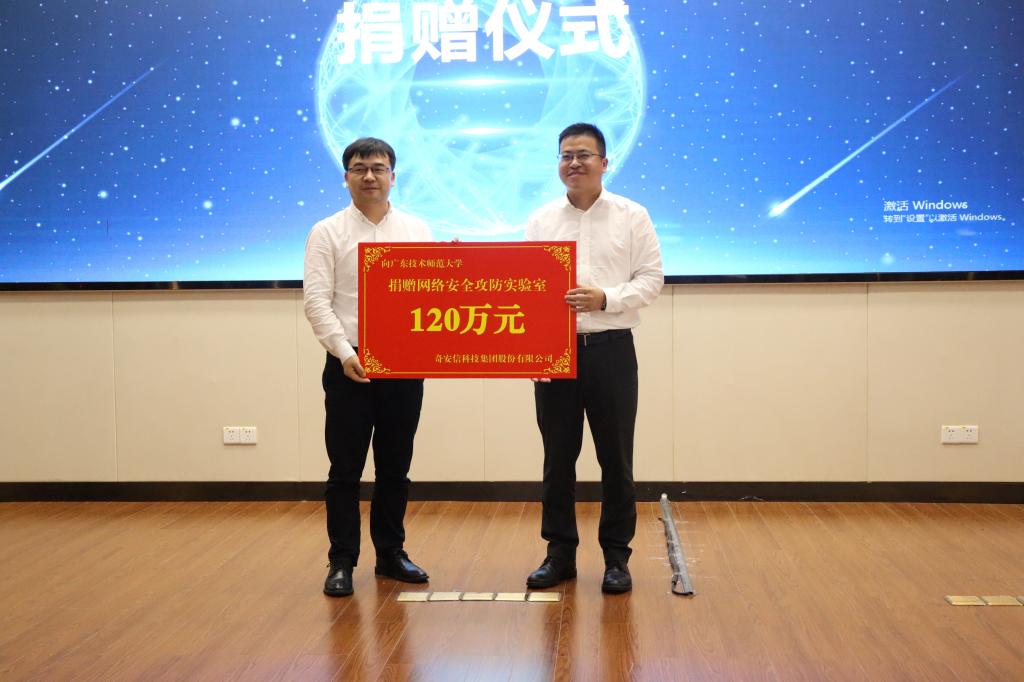 戴青云代表学校对与会嘉宾表示热烈欢迎。她表示,此次活动的举行,是为了落实国家和省相关文件要求,发挥我校“技术+师范”特色优势,构建科产学全方位、全过程、深融合的协同育人长效机制,扎实推进新工科建设再深化、再拓展、再突破、再出发,协调推进新工科与新师范、新文科、服务社会融合发展,为应用型高校建设提供可复制、可推广的广师大新模式。2019年12月,我校与奇安信集团签订战略合作框架协议。两年多来,校企双方积极推动融人才培养、科学研究、技术创新、企业服务、学生创业等功能于一体的示范性人才培养实体建设,共建了网络空间安全学院,打造了产教融合示范基地,共同开创了双方互利、互动、多赢的良好局面。现在,广师大与行业龙头企业联手创建信创与网络安全产业学院,将进一步优化资源共享、实现优势互补,共同探索构建信创与网络安全产业链所需要的中高本硕博层次贯通、产教融合融通的高素质技能型、应用型人才培养体系。奇安信集团带着满满的诚意,为学校捐赠价值120万元的网络安全攻防实验平台,双方共建“广师大—网络安全攻防实验室”,这是校企深度融合,也是产业学院成立后的落地成果之一。