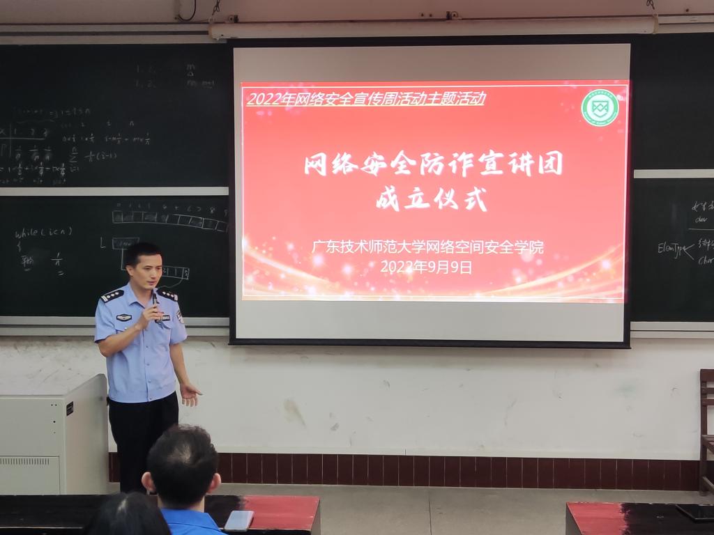 为响应2022年国家网络安全宣传周校园日主题活动要求,发挥网络空间安全专业的特色优势,更好地服务学校、服务社会,网络空间安全学院在新学期发动学生志愿者成立了网络安全防诈宣讲团。9月9日,网络空间安全学院在西校区教学楼媒体三教室举行了宣讲团成立仪式。天河区公安局石牌派出所赖钧政警官、学院党委肖茵茵副书记以及宣讲团学生代表出席了仪式。