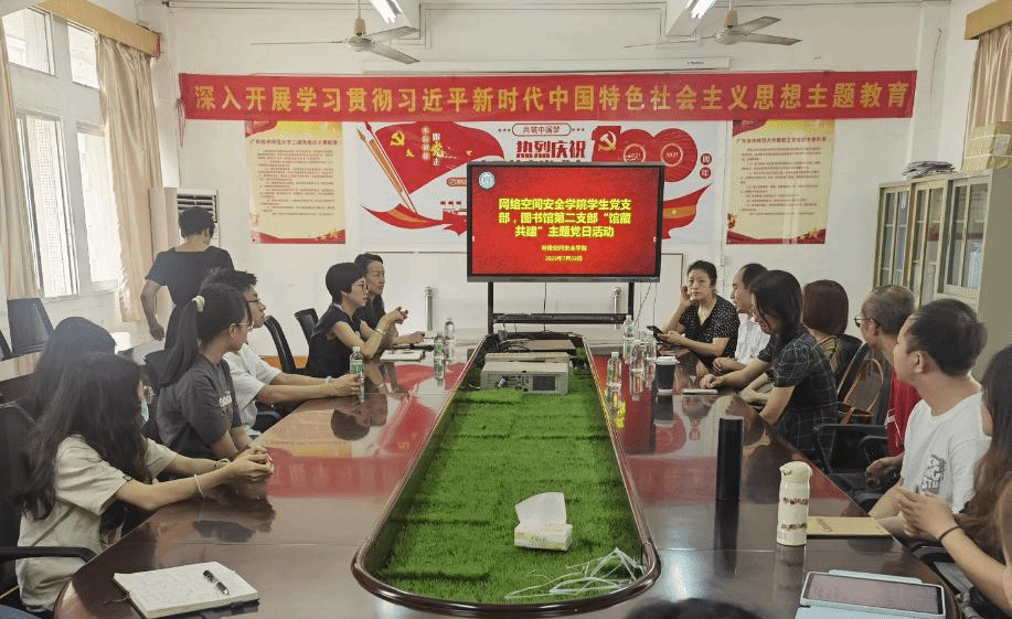 为深入开展学习贯彻习近平新时代中国特色社会主义思想主题教育,坚持以学促干,7月3日,网络空间安全学院学生党支部与学校图书馆第二党支部在西校区联合开展“馆藏共建”主题党日活动。网安学院党委书记陈小花、副书记肖茵茵,图书馆馆长白崇、第二党支部书记尹小红及双方支部党员近40人参加了活动。