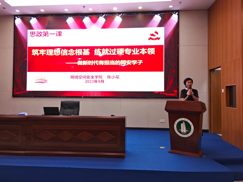 陈小花以《筑牢理想信念根基,练就过硬专业本领——做新时代有担当的网安学子》为主题向新生们讲授了“思政第一课”。她对2023级本科新生提出三点希望:一是学习党的二十大精神,筑牢理想信念根基;二是积极做好大学规划,练就过硬专业本领,建议新生从当下开始思考规划自己的职业生涯,努力实现自己的人生价值,为社会主义现代化建设贡献力量;三是弘扬伟大建党精神,做有担当的网安学子,要求新生认真学习建党精神,做有担当的网安学子,成长为党和国家所需的网安人才。