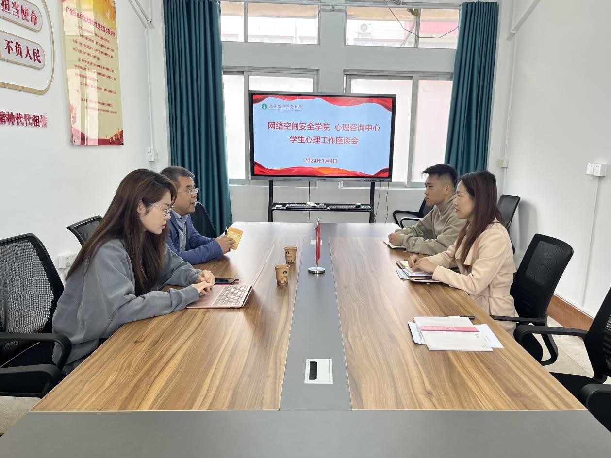 会上,肖茵茵介绍了网络空间安全学院学生心理健康基本情况、本学期危机事件情况、学院心理工作举措等。任增辉对网络空间安全学院扎实细致推进心理健康教育工作表示肯定,并结合专业心理知识和经验,针对学生心理健康教育存在的具体问题,从预防、干预等方面提供了宝贵的意见和建议。后续,双方就心理健康活动与心理危机干预对接过程中遇到的问题、重点关注人群进行了探讨与经验分享。