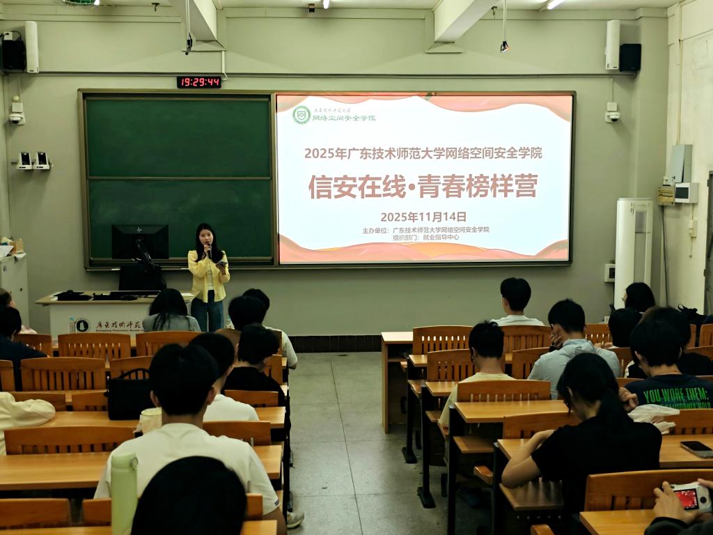 为落实就业育人目标,增强学生职业规划意识,11月14日晚,网络空间安全学院在西校区教学楼媒一举办“信安在线·青春榜样营”就业力UP训练营系列活动。学院校友兼创业导师、喜仕(广州)网络科技有限公司创始人陈子力,原网络安全科普科创协会会长、学院25级研究生郑心怡等优秀师生代表以及2025级本科新生参与了此次活动。