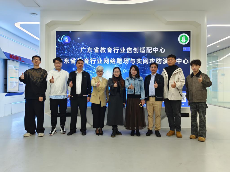 肖茵茵首先对梁校长一行的到来表示热烈欢迎,随后阮剑亮带领与会人员实地参观了位于西校区实训楼三楼的广东省教育行业信创适配中心、广东省教育行业网络靶场与实网攻防演练中心。梁校长一行对省级“双中心”与学校“智慧校园”在国产化、技术化、智能化方面取得的建设成果给予了高度赞赏。