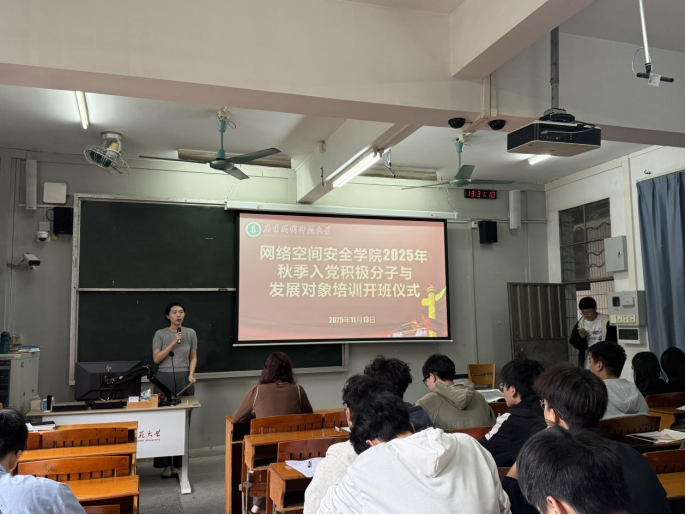 11月13日下午,网络空间安全学院2025年下半年入党积极分子和发展对象党校培训开班仪式在西校区教学楼307教室举行。学院党委副书记肖茵茵出席仪式并讲授首场专题党课,专职组织员阙惠华主持仪式。本次培训以深入学习贯彻习近平新时代中国特色社会主义思想为核心,旨在提升学员政治理论素养与党性修养,端正入党动机,保障党员发展质量。